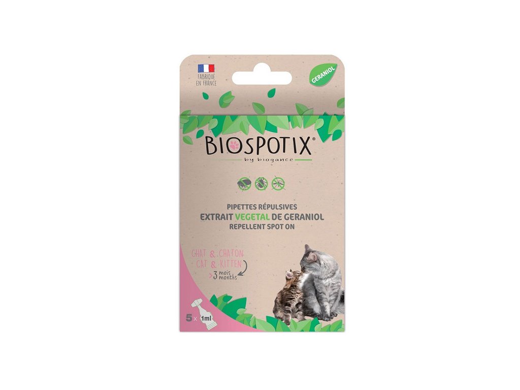 Biogance Biospotix Cat spot-on s repelentním účinkem pro koťata od 3. měsíců a dospělé kočkyAktivní látky: Geraniol 0,75 % (m/m), (CAS č. 106-24-1).