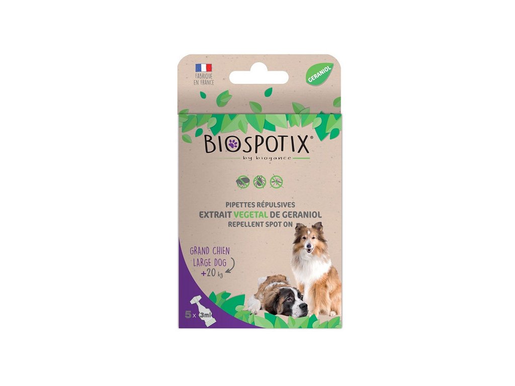 Biogance Biospotix Dog spot-on pipety L-XL s repelentním účinkem pro štěňata od 3. měsíců a dospělé psy všech plemen nad 20 kgAktivní látky: Geraniol 0,75 % (m/m), (CAS č. 106-24-1).