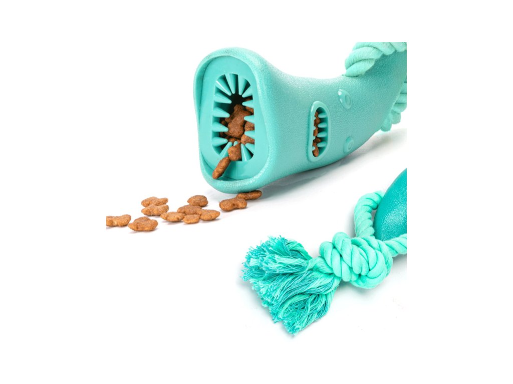 Gumová hračka ve tvaru zubu s šňůrou je víceúčelová hračka pro psy všech plemen. Otvorem v hračce lze naplnit drobnými pamlsky nebo granulkami. Díky svému tvaru je obzvlášť vhodná k masáži dásní.