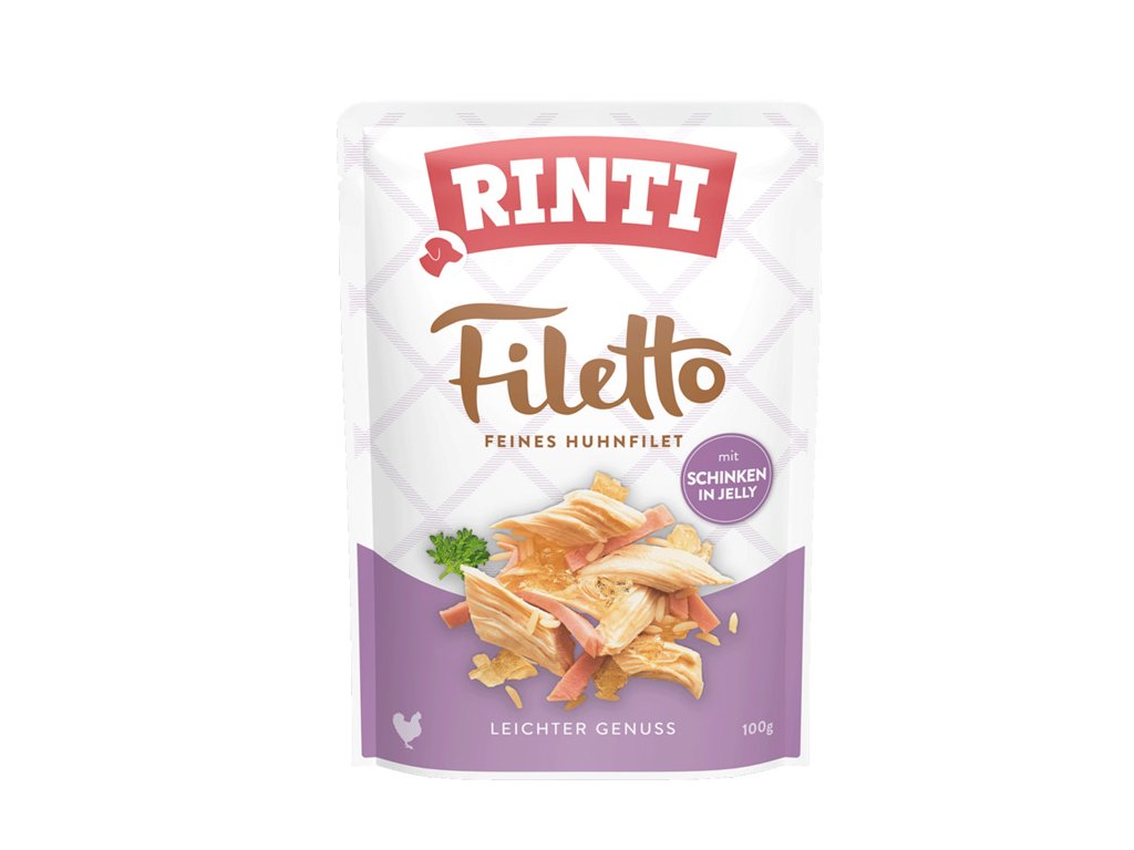 Rinti Filetto jsou delikátní kousky filé z kuřecího masa v jemné želatině doplněné o kousky vepřové šunky. Tato lahodná doplňková strava balená v kapsičce obohatí jídelníček i těch nejnáročnějších psů. Praktické a snadno otevíratelné balení umožňuje podávat toto krmivo kdekoliv, a tak je ideální balení během dobrodružných cest s vaším psím mazlíčkem.