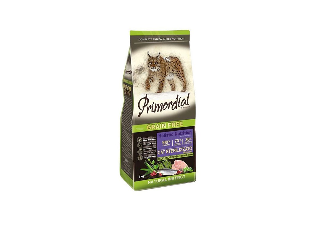 Kočičí jídelníček neobsahuje žádné obiloviny, protože kočky jsou striktní masožravci a výborní predátoři, kteří se vždy živili čerstvým masem a čerstvými rybami. Primordial Grain-Free Neutered Cat Turkey and Herring je kompletní, vysoce stravitelná bezobilná receptura bohatá na bílkoviny vysoké biologické hodnoty a obsahuje vhodnou kompozici aminokyselin. Krůtí maso, výhradně z volného chovu, je velmi chutné a obsahuje pro kočky snadno stravitelné bílkoviny. Sleď poskytuje kompletní bílkoviny a je bohatým zdrojem omega-3 mastných kyselin, které jsou důležité pro zdravou kůži a srst a jsou také velmi prospěšné pro kardiovaskulární systém (srdce a cévy). Ovoce a zelenina bohaté na vitaminy, minerály a fytonutrienty, lespedeza s blahodárnými účinky na močové cesty a brusinky s antioxidační funkcí dodávají tomuto krmivu dokonalou rovnováhu chuti a živin. Opravdu holistický produkt, který aktivně přispívá k celkovému zdraví kočky.