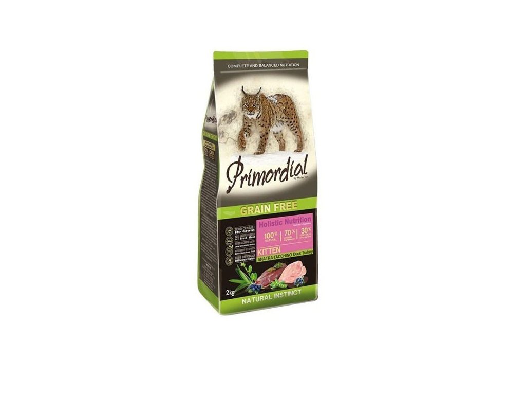 Primordial GF Kitten kachní a krůtí je kompletní vysoce stravitelné bezobilné krmivo bohaté na bílkoviny vysoké biologické hodnoty a obsahuje vhodnou kompozici aminokyselin. Kachní a krůtí maso - striktně z volného výběhu, nabízí lehce stravitelné bílkoviny a atraktivní chuť, kterou kočky milují. Toto krmivo, obohacené o ovoce a zeleninu, které poskytují vitamíny, minerály a fytonutrienty, o lespedezu s blahodárnými účinky na močové cesty, brusinky s antioxidační funkcí a lněné semínko, kvalitní zdroj omega 3 mastných kyselin, které plní důležitou funkci pro zdravou kůži a srst, představuje dokonalou rovnováhu chuti a živin.