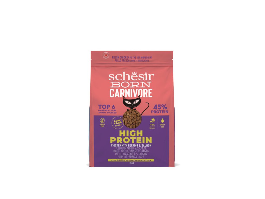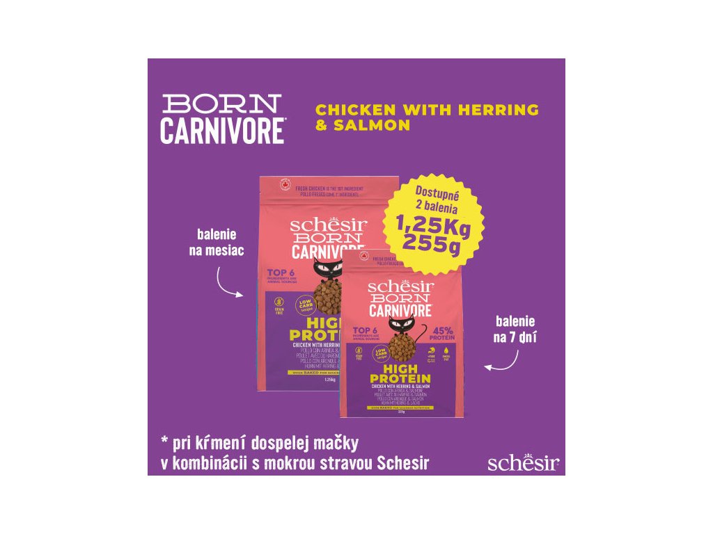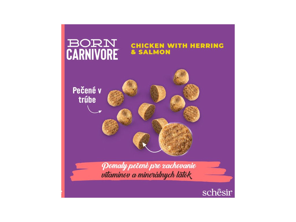 Schesir Cat Born Carnivore Adult - Čerstvé kuřecí se sleďem a lososem je kompletní krmivo ve formě pomalu pečených granulí pro dospělé kočky s vysokým obsahem bílkovin. Receptura Born Carnivore byla vyvinuta pro skutečné kočičí masožravce s fyziologickou potřebou přijímat čerstvé maso a ryby. Receptura inspirovaná přirozenou potravou koček ve volné přírodě s vysokým obsahem bílkovin (45%) při nízkém obsahu sacharidů (11,3%).
