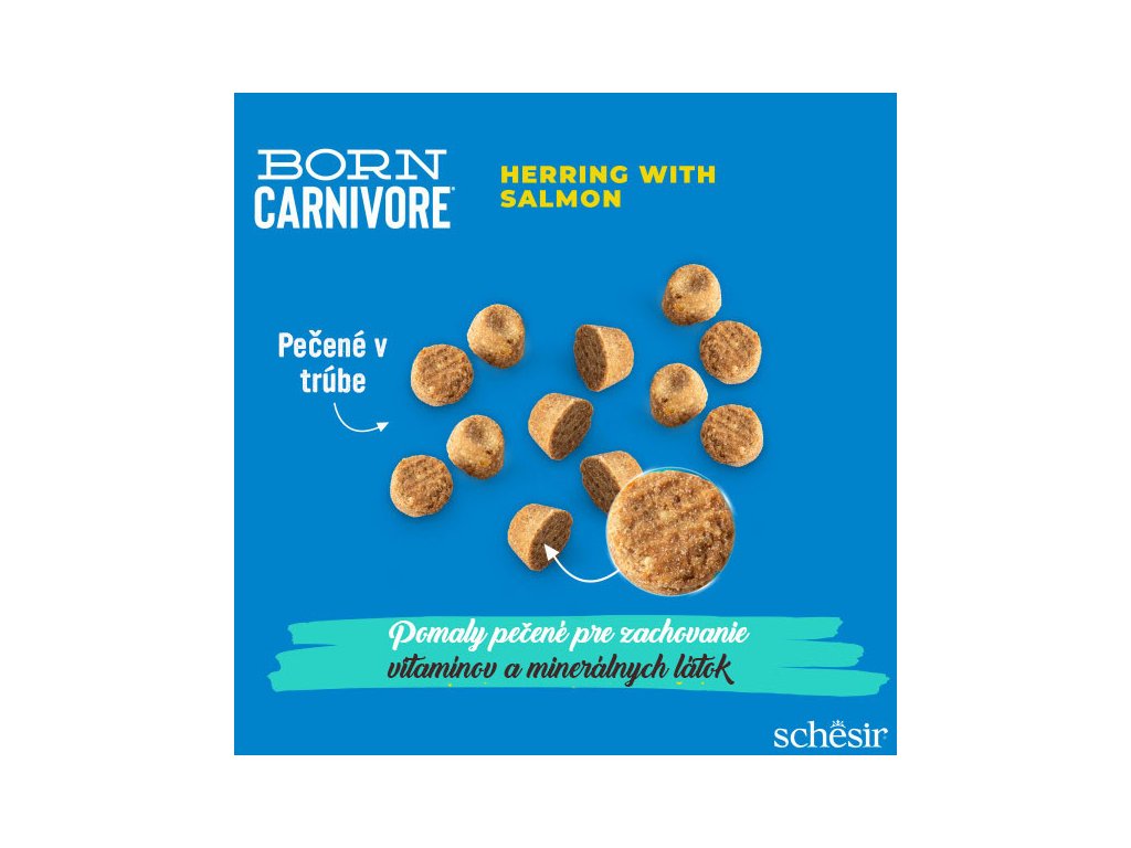Schesir Cat Born Carnivore Adult - Čerstvý sleď a losos je kompletní krmivo ve formě pomalu pečených granulí pro dospělé kočky s vysokým obsahem bílkovin. Receptura Born Carnivore byla vyvinuta pro skutečné kočičí masožravce s fyziologickou potřebou přijímat čerstvé ryby. Receptura inspirovaná přirozenou potravou koček ve volné přírodě s vysokým obsahem bílkovin (43%) při nízkém obsahu sacharidů (12%).