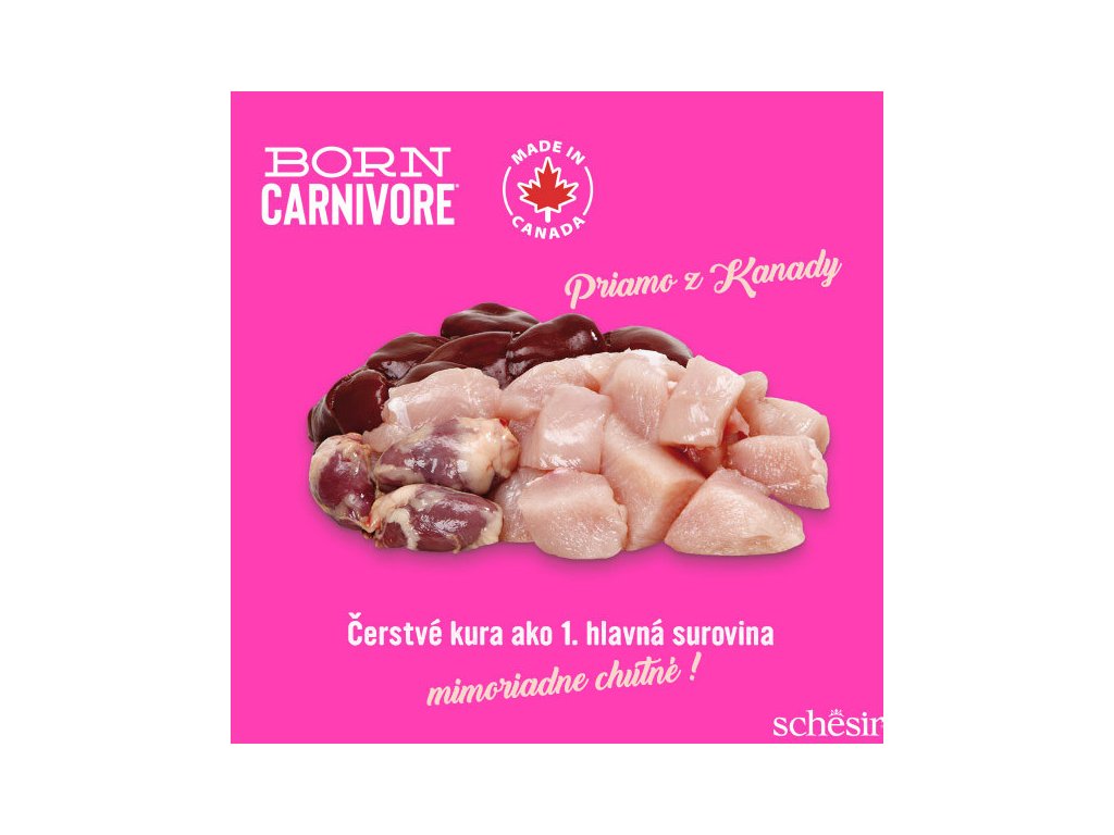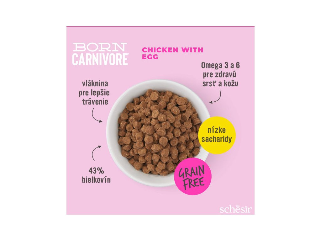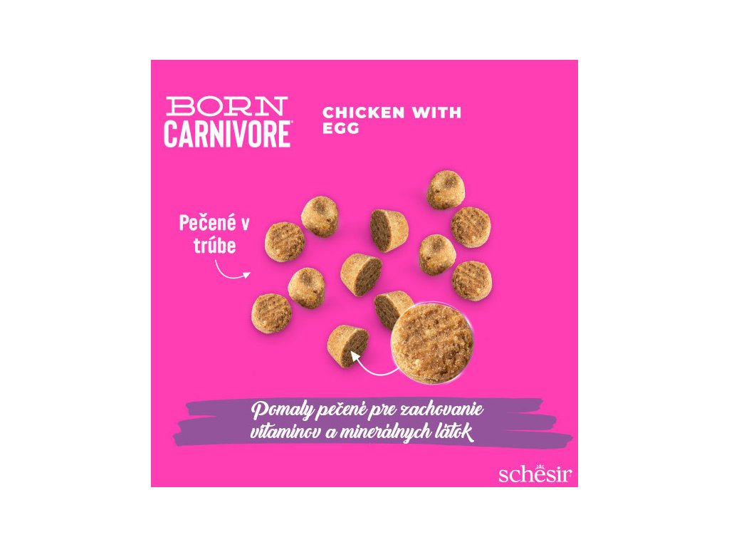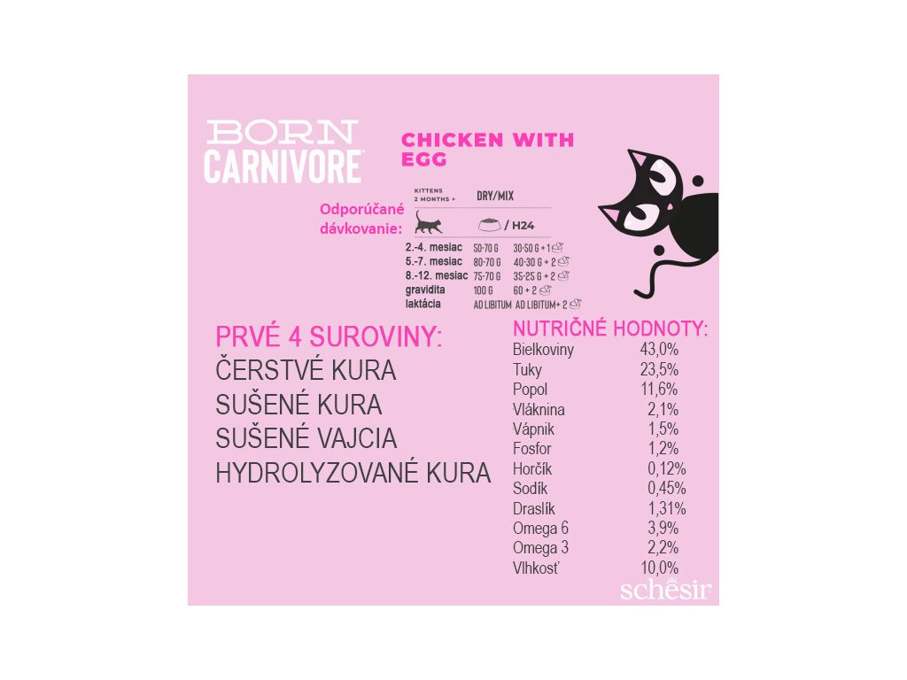 Schesir Cat Born Carnivore Kitten - Čerstvé kuře s vejcem je kompletní krmivo ve formě pomalu pečených granulí pro koťata s vysokým obsahem bílkovin. Receptura Born Carnivore byla vyvinuta pro skutečné kočičí masožravce s fyziologickou potřebou přijímat čerstvé maso a ryby. Receptura inspirovaná přirozenou potravou koček ve volné přírodě s vysokým obsahem bílkovin (43%) při nízkém obsahu sacharidů (9,8%).