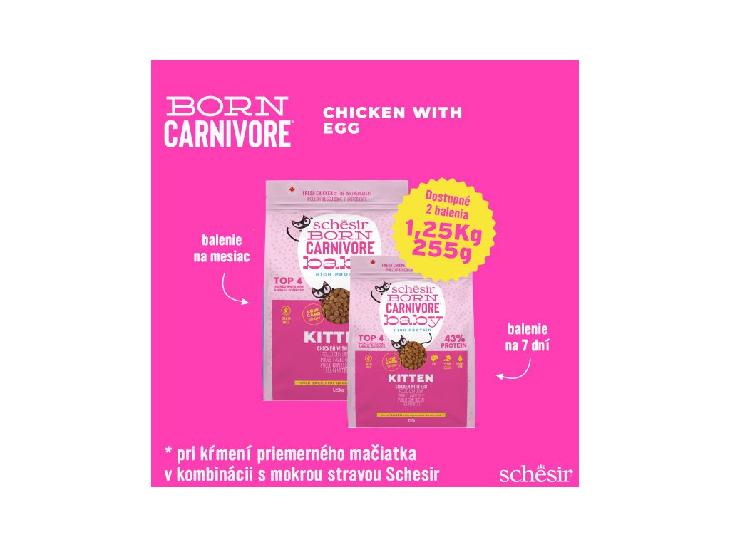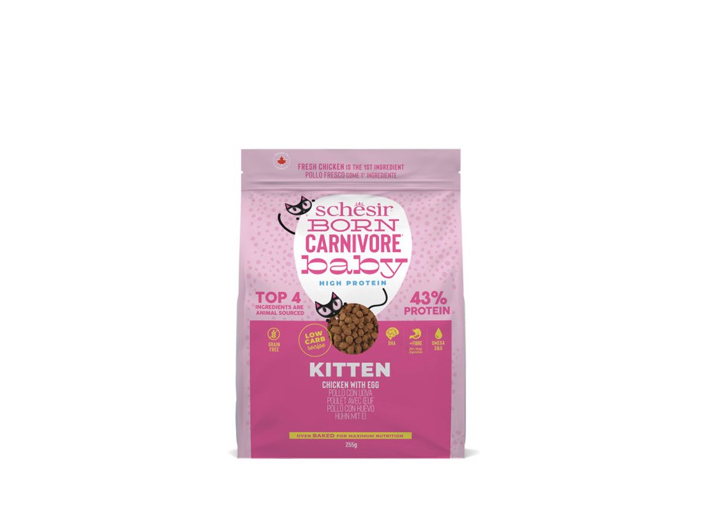 Schesir Cat Born Carnivore Kitten - Čerstvé kuřecí s vejcem je kompletní krmivo ve formě pomalu pečených granulí pro koťata s vysokým obsahem bílkovin. Receptura Born Carnivore byla vyvinuta pro skutečné kočičí masožravce s fyziologickou potřebou přijímat čerstvé maso a ryby. Receptura inspirovaná přirozenou potravou koček ve volné přírodě s vysokým obsahem bílkovin (43%) při nízkém obsahu sacharidů (9,8%).