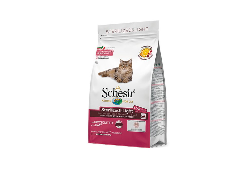 Schesir Cat Sterilized - šunka s rýží je krmivo bohaté na vepřové maso s rýží. Vysoce kvalitní a snadno stravitelné granule s vepřovým masem doporučilo oddělení veterinárních lékařských věd Univerzity v Bologni. Receptura je sestavena z jediného zdroje živočišných bílkovin a je bohatá na přírodní složky, s přídavkem vitamínů a minerálů, aby uspokojila nutriční potřeby kastrovaných koček jakéhokoli plemene, v různých fázích života a pomohla jim udržet optimální váhu.