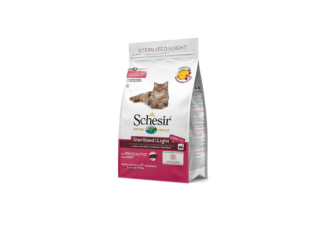 Schesir Cat Sterilized - šunka s rýží je krmivo bohaté na vepřové maso s rýží. Vysoce kvalitní a snadno stravitelné granule s vepřovým masem doporučilo oddělení veterinárních lékařských věd Univerzity v Bologni. Receptura je sestavena z jediného zdroje živočišných bílkovin a je bohatá na přírodní složky, s přídavkem vitaminů a minerálů, aby uspokojila nutriční potřeby sterilizovaných koček jakéhokoli plemene, v různých stádiích života a pomohla jim udržet optimální hmotnost.
