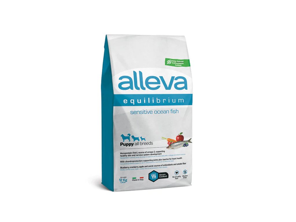 Alleva Equilibrium Dog Puppy All Breeds Sensitive Ocean Fish je kompletní a vyvážené krmivo pro štěňata všech plemen a pro březí a kojící feny. Krmivo s obsahem mořských ryb. Zvláště vhodné pro štěňata s citlivým trávením.
