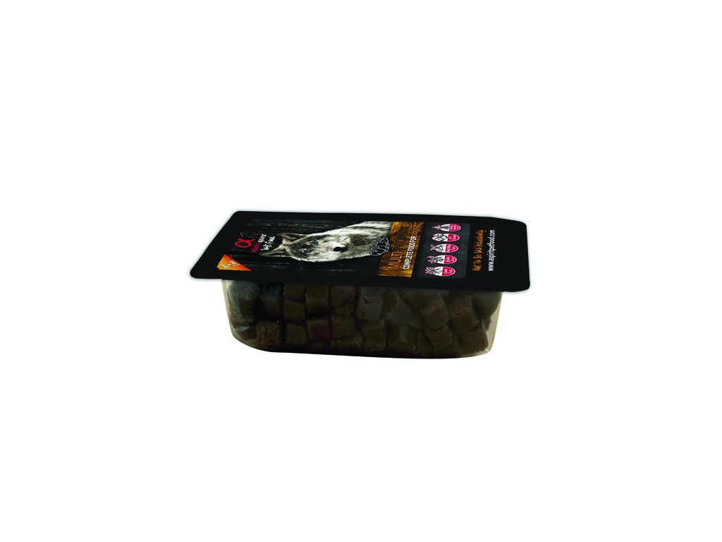 Unikátní mimořádně zdravé studeně lisované měkké krmivo pro všechna plemena psů od 1. roku života. Kompletní polovlhké krmivo je díky své měkké textuře vhodné i pro malá plemena psů, a to i pro starší jedince s problémovým chrupem. Na výrobu 1 kg granulí bylo použito 2,5 kg čerstvého masa a ryb.