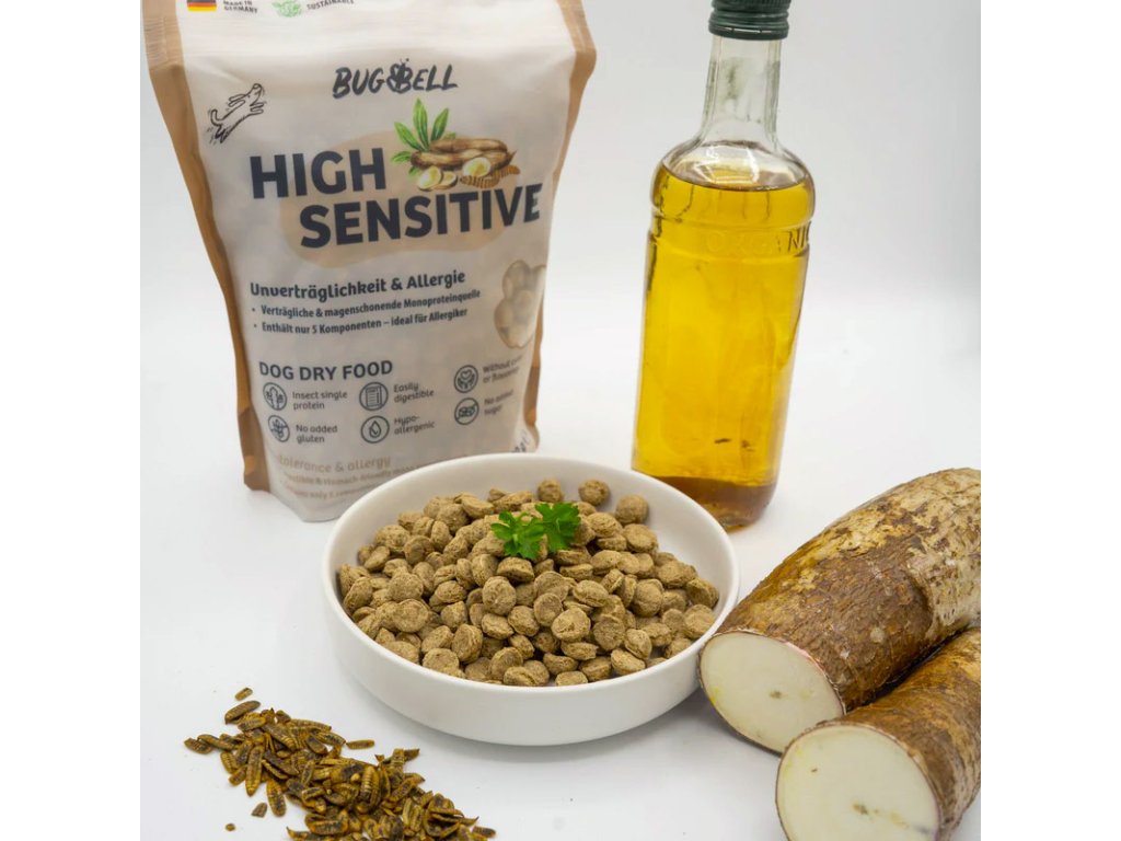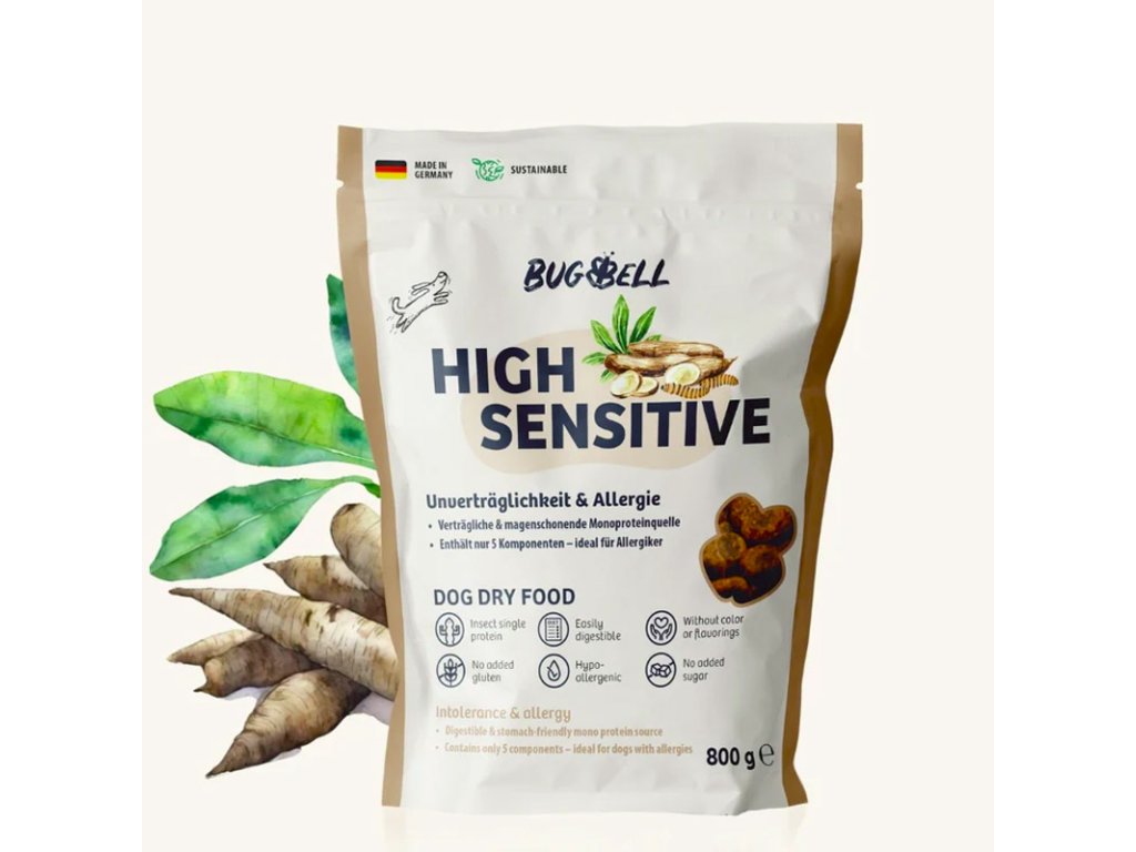 Animonda BugBell Dog - High Sensitive je hypoalergenní krmivo kombinující sílu vysoce kvalitního hmyzu (Hermetia illucens) s hypoalergenními složkami – ideální pro psy s citlivým trávením nebo potravinovými intolerancemi. Receptura je založena na několika, jasně deklarovaných složkách, a proto je vhodná pro diety s omezeným množstvím složek a chronická střevní onemocnění, jako je IBD. Jeho okyselující vlastnosti pomáhají stabilizovat močové prostředí a tím snížit riziko tvorby struvitových kamenů. Díky záměrně sníženému obsahu fosforu, bílkovin a hořčíku je krmivo vhodnou volbou i pro psy se selháním ledvin – vždy po konzultaci s veterinářem.