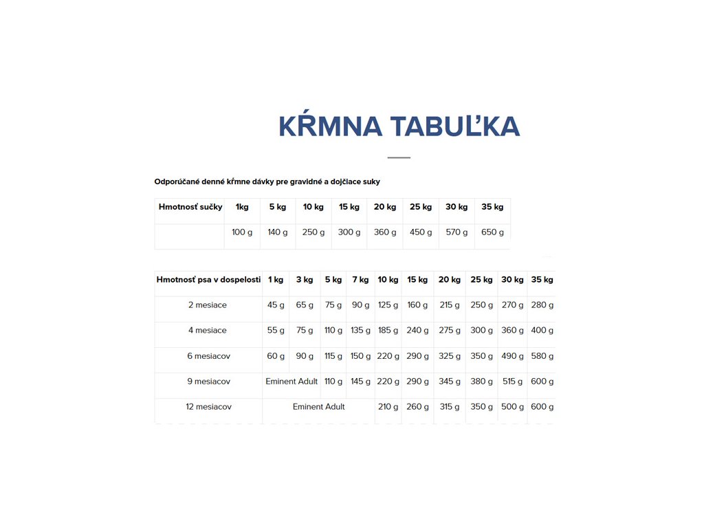 Krmivo Eminent Puppy obsahuje minimálně 80 % proteinů živočišného původu. 360 g dehydrovaného drůbežího masa v 1 kg krmiva odpovídá 1 340 g čerstvého masa.