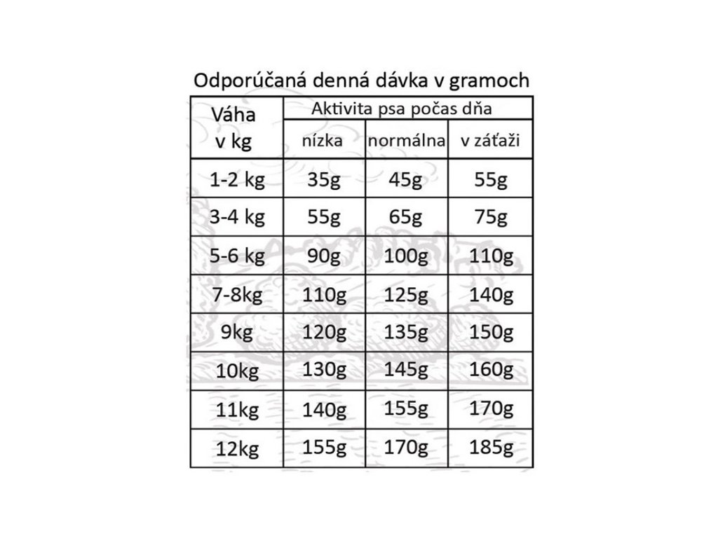 Pokyny: krmivo Fresh Farm Horse & Rice je kompletní krmivo s obsahem všech živin potřebných pro zdravý a dlouhý život Vašeho psa. Nezapomeňte však zajistit stálý přístup k čisté čerstvé vodě. Doporučené dávkování najdete v tabulce vpravo. Při změně krmiva doporučujeme postupný přechod minimálně po dobu 2 týdnů, aby si organismus psa zvykl na změnu. Skladujte na suchém a chladném místě.