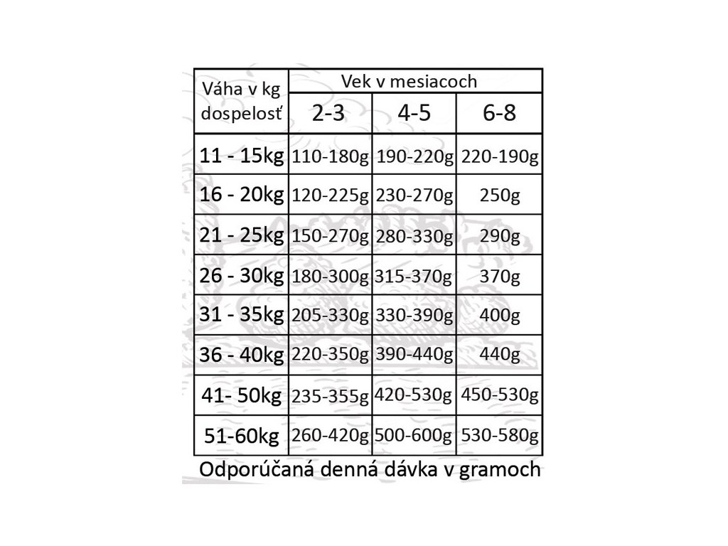 Pokyny: krmivo Fresh Farm Puppy je kompletní krmivo s obsahem všech živin potřebných pro zdravý vývoj vašeho štěněte. Nezapomeňte však zajistit stálý přístup k čisté čerstvé vodě. Doporučené dávkování najdete v tabulce vpravo. Při změně krmiva doporučujeme postupný přechod minimálně po dobu 2 týdnů, aby si organismus psa zvykl na změnu. Skladujte na suchém a chladném místě.