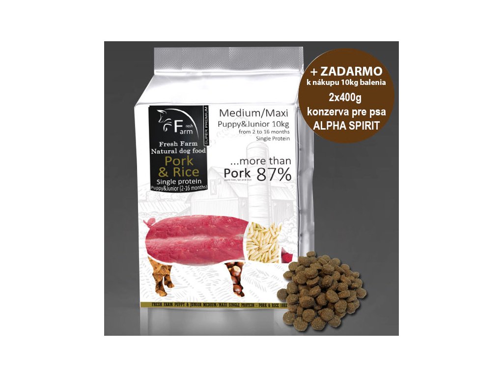 Fresh Farm Puppy&Junior Single Protein Medium&Maxi - Pork &Rice je kompletní bezlepkové krmivo pro štěňata a mladé psy od 2. do 16. měsíce života. Určené pro střední a velká plemena psů nad 10 kg s obsahem jediného živočišného proteinu (vepřové) chovaného na italských farmách. Ideální pro psy s intolerancí na jiné druhy živočišných bílkovin. Doplňky kloubní výživy přispívají ke zdravému vývoji pohybového aparátu. Lněný a lososový olej udržují zdravou pokožku a krásnou lesklou srst. Krmivo bez použití přidaných barviv, dochucovadel a chemických konzervantů.