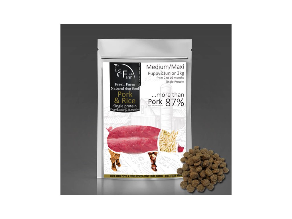 Fresh Farm Puppy&Junior Single Protein Medium&Maxi - Pork &Rice je kompletní bezlepkové krmivo pro štěňata a mladé psy od 2. do 16. měsíce života. Určeno pro střední a velká plemena psů nad 10 kg s obsahem jediného živočišného proteinu (vepřové) chovaného na italských farmách. Ideální pro psy s intolerancí na jiné druhy živočišných bílkovin. Doplňky kloubní výživy napomáhají zdravému vývoji pohybového aparátu. Lněný a lososový olej udržují zdravou kůži a krásnou lesklou srst. Krmivo bez použití přidaných barviv, dochucovadel a chemických konzervantů.
