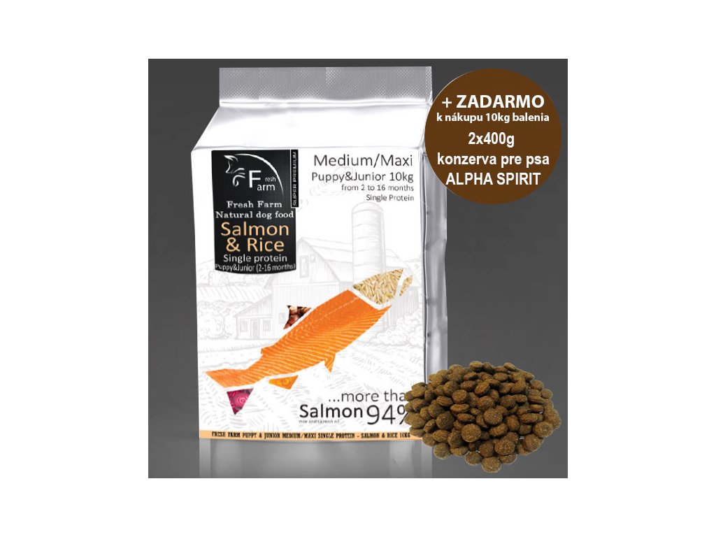 Fresh Farm Puppy&Junior Single Protein Medium&Maxi - Salmon &Rice je kompletní bezlepkové krmivo pro štěňata a mladé psy od 2. do 16. měsíce života. Určeno pro střední a velká plemena psů nad 10 kg s obsahem jediného živočišného proteinu (norský losos). Ideální pro psy s intolerancí na jiné druhy živočišných bílkovin. Doplňky kloubní výživy pomáhají ke zdravému vývoji pohybového aparátu. Lněný a lososový olej udržuje zdravou kůži a krásnou lesklou srst. Rýže jako jediný druh bezlepkové obiloviny zajišťuje vysokou stravitelnost krmiva. Krmivo bez použití přidaných barviv, dochucovadel a chemických konzervantů.