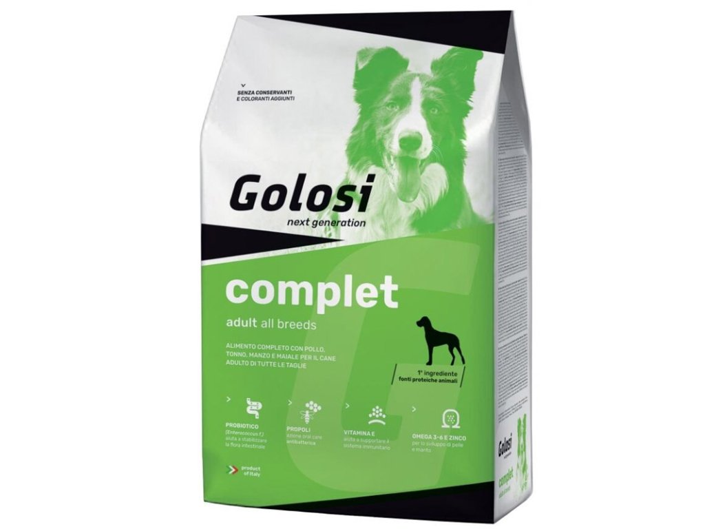 Golosi Complet All Breeds je kompletní krmivo s kuřecím, hovězím a vepřovým masem doplněné o sušeného tuňáka pro dospělé psy všech velikostí. Golosi Complet je ideální nutriční řešení pro dospělé psy všech velikostí; kuřecí a tuňákové maso jsou obzvláště lehké a stravitelné, zatímco hovězí a vepřové maso poskytují vysokou chutnost a zároveň respektují přirozené prostředí psů. Propolis poskytuje péči o ústní dutinu a antibakteriální vlastnosti, čímž zabraňuje tvorbě zubního povlaku. Vhodné doplnění vitamínů a minerálů také nabízí důležitou podporu pro tělo tím, že pomáhá omezovat oxidační procesy, zatímco omega-3 a -6 a zinek jsou cennými spojenci pro kůži a srst, pro chuť, která je zaměřena na pohodu.