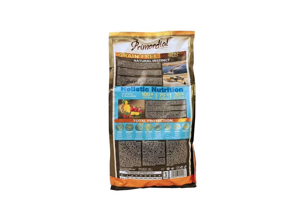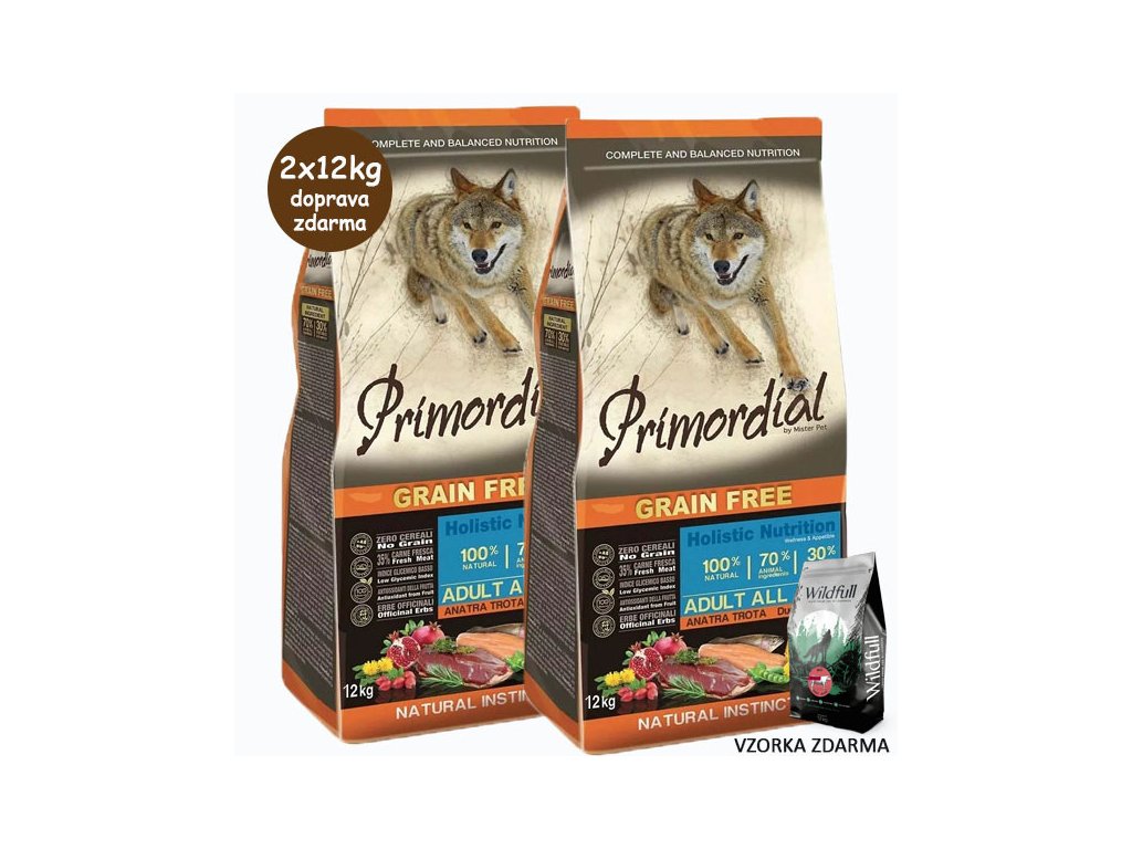 Primordial GF Adult - pstruh s kachnou je kompletní bezobilné krmivo bohaté na proteiny vysoké biologické hodnoty a obsahuje vhodnou kompozici aminokyselin. Kachní maso, striktně z volného výběhu, poskytuje kompletní bílkoviny a atraktivní chuť, kterou psi milují. Pstruh, ryba žijící jen v čistých a průzračných vodách, poskytuje lehce stravitelné bílkoviny a jako všechny ryby je bohatý na omega-3 mastné kyseliny, které mají důležitou kosmetickou funkci pro kůži a srst a jsou velmi prospěšné pro kardiovaskulární systém (srdce a cévy). Ovoce a zelenina bohaté na vitaminy, minerály a fytonutrienty, trávicí účinky ananasu, antioxidační funkce granátového jablka a šípků a podpora jater ze strany ostropestřce dodávají tomuto krmivu dokonalou rovnováhu chuti a živin.