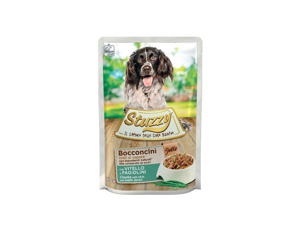 Stuzzy Dog - telecí s fazolkou je strava vařená v páře, bez barviv nebo konzervačních látek; připravená v želé, ve vynikající omáčce. Obsahuje vitamíny a minerály užitečné pro podporu zdravé pokožky a lesklé srsti a pro zajištění účinného vstřebávání živin.