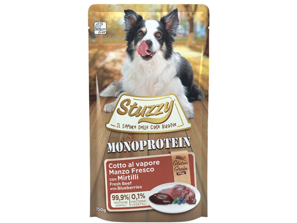 Stuzzy Monoprotein - hovězí paté je krmivo s kvalitními ingrediencemi pro psy všech plemen a speciálně pro psy trpící intolerancí živočišných nebo rostlinných bílkovin. S jediným zdrojem živočišných bílkovin, bez obilovin a lepku, vysoce stravitelné, bez přidaných barviv a konzervačních látek. Obsahuje borůvky, které mírně snižují hladinu cukru v krvi. Dále vlákninu, která upravuje zácpu i průjem, pomáhá vylučovat toxické látky z těla, snižovat hladinu cholesterolu a zároveň působí pozitivně na kůži a srst. Bez testování na zvířatech s výživově schváleným složením Katedry veterinárních lékařských věd - Univerzita Alma Mater Studiorum v Bologni.