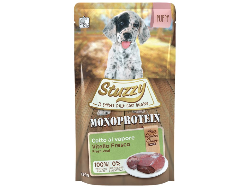 Stuzzy Monoprotein Puppy - telecí paté je krmivo s kvalitními ingrediencemi pro štěňata všech plemen a zejména pro psy trpící intolerancí na živočišné nebo rostlinné bílkoviny. S jediným zdrojem živočišných bílkovin, bez obilovin a lepku, vysoce stravitelné, bez přidaných barviv a konzervačních látek. Netestováno na zvířatech s nutričně schváleným složením Katedry veterinárních lékařských věd - Universita Alma Mater Studiorum v Bologni.
