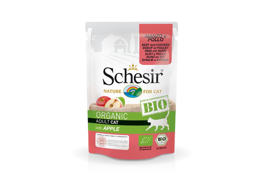 Schesir BIO - hovězí a kuřecí s jablkem patří do řady krmiv pro dospělé kočky. Je to kompletní a vyvážená strava kontrolovaná a certifikovaná prostřednictvím DE-OKO, autorizovaného certifikačního orgánu, uznaná a povolená příslušnými evropskými orgány. Živočišná bílkovina je vždy první složkou. Jak ukazují provedené analýzy, je vysoce stravitelná a její složení bylo z nutričního hlediska schváleno Katedrou veterinárních lékařských věd Univerzity Alma Mater Studiorum v Bologni. Neobsahuje umělá konzervační látky ani barviva.