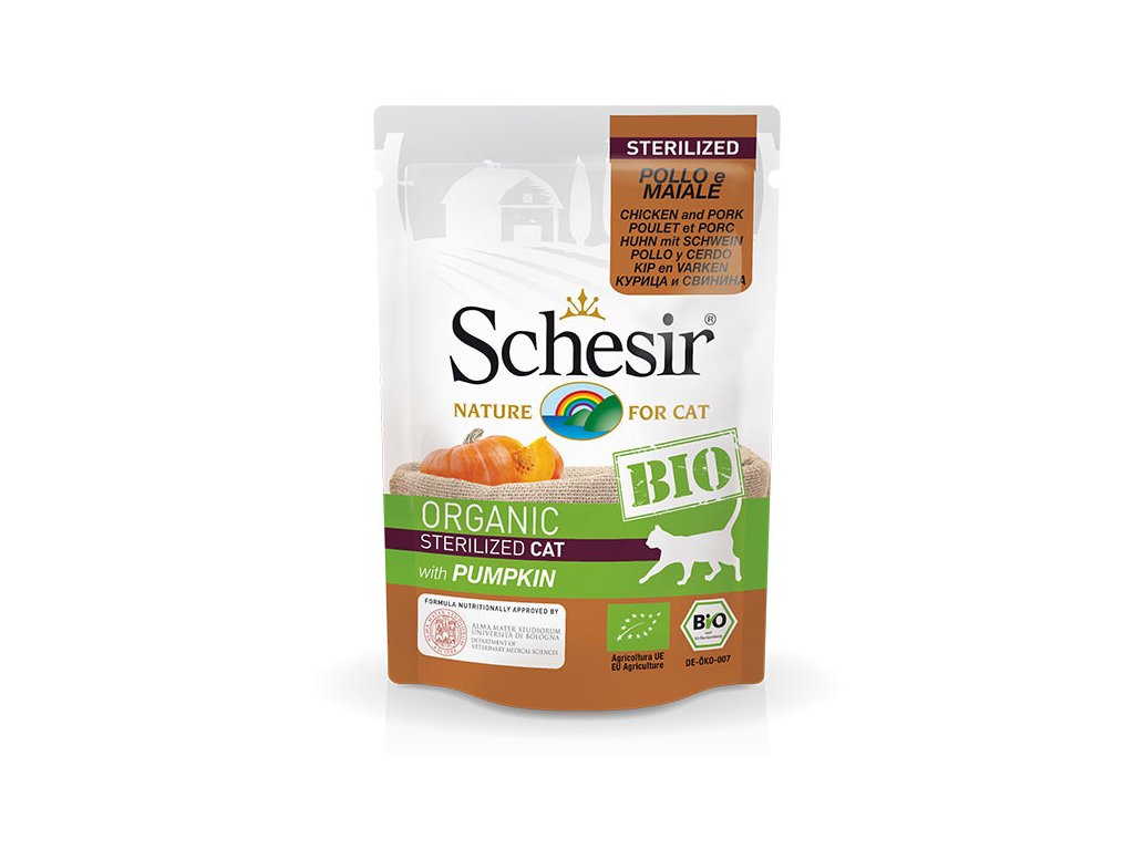 Schesir BIO Sterilized - kuřecí a vepřové s dýní patří do řady krmiv pro dospělé kočky. Jedná se o kompletní a vyvážené krmivo kontrolované a certifikované prostřednictvím DE-OKO, autorizovaného certifikačního orgánu, uznaného a povoleného příslušnými evropskými orgány. Živočišná bílkovina je vždy první složkou. Jak ukazují provedené analýzy, je vysoce stravitelná a její složení bylo z nutričního hlediska schváleno Katedrou veterinárních věd Univerzity Alma Mater Studiorum v Bologni. Neobsahuje umělé konzervanty ani barviva.