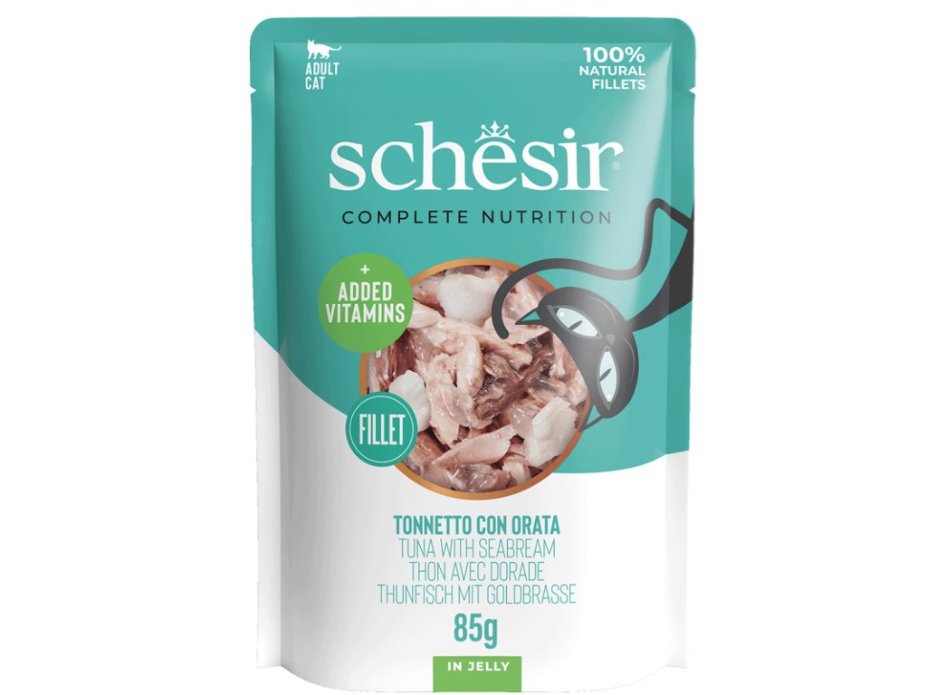 Schesir Cat Complete & Balanced Wet Adult - Tuňák a pražma v želé je kompletní a vyvážené krmivo ve formě filet z tuňáka a pražmy určené pro dospělé kočky. Doplněné o vitamíny a minerální látky z něj dělají plnohodnotné krmivo vhodné pro každý den.