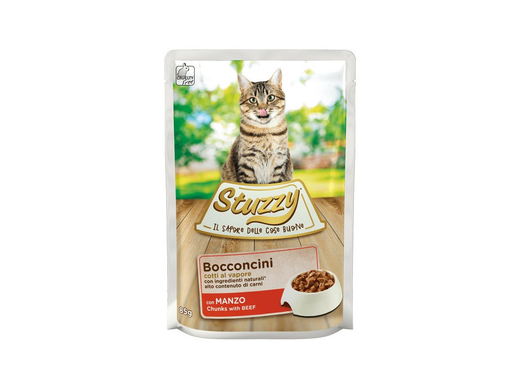 Stuzzy Cat Chunks - Hovězí kousky v šťávě je kompletní krmivo z hovězího masa s novým receptem a v novém formátu dušené v páře tak, aby bylo pro kočky ještě atraktivnější.