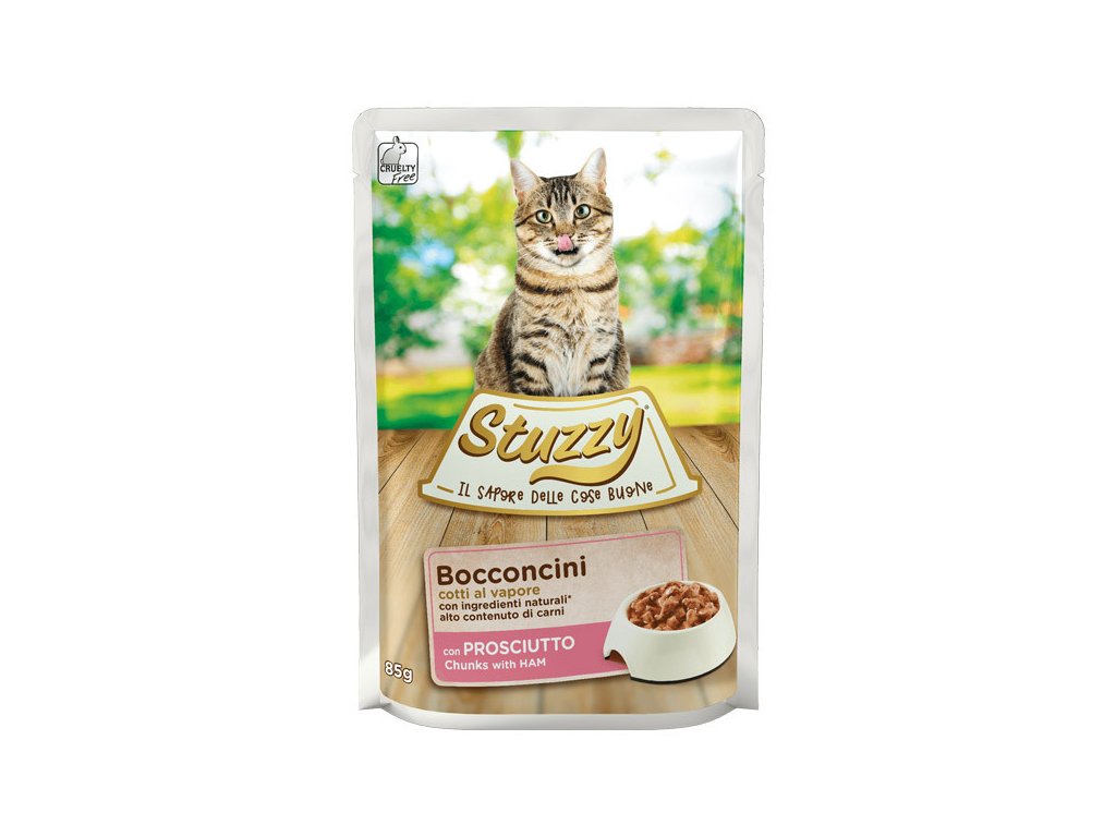 Stuzzy Cat Chunks - Vepřové kousky ve šťávě je kompletní krmivo ze šunky s novým receptem a v novém formátu dušené v páře tak, aby bylo pro kočky ještě atraktivnější.