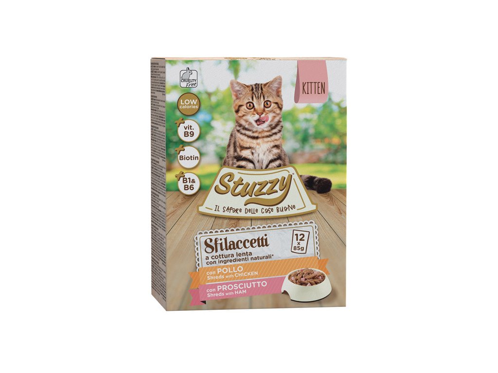 Stuzzy Cat Shreds Multipack Kitten - trhané kuřecí a vepřové maso 12x85g - šťavnaté trhané maso v chutné omáčce pro zdravý vývoj a vitalitu koťat.
