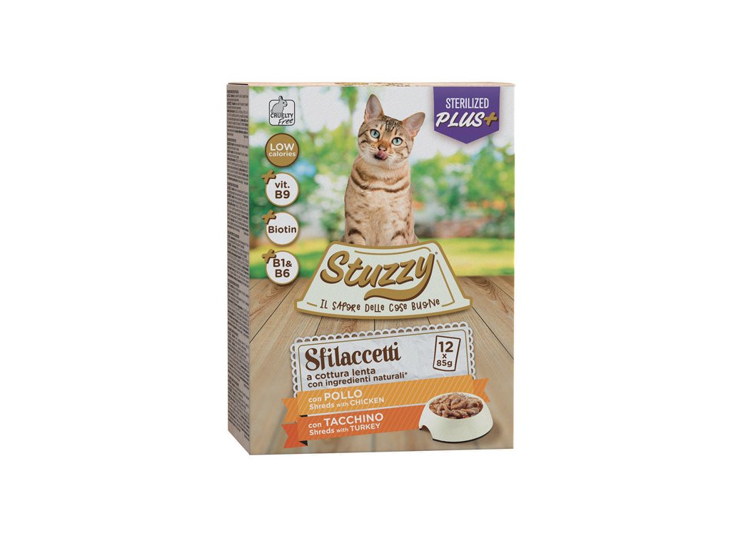 Stuzzy Cat Shreds Multipack Sterilized trhané kuřecí a krůtí maso - šťavnaté kousky masa v chutné omáčce pro zdravý vývoj a vitalitu kastrované kočky.