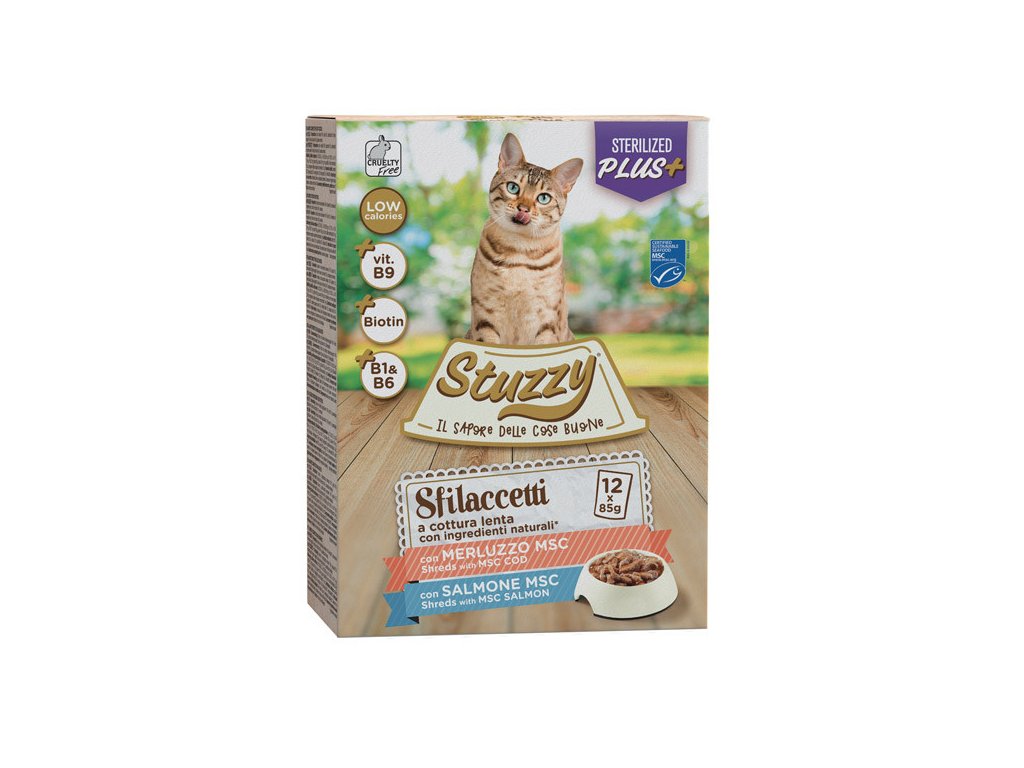 Stuzzy Cat Shreds Multipack Sterilized trhané maso z tresky a lososa - šťavnaté kousky trhaného masa z ryb v chutné omáčce pro zdravý vývoj a vitalitu kastrované kočky. Ryby pocházejí z trvale udržitelných chovů.
