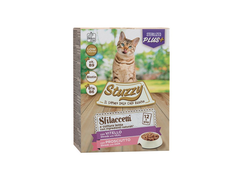 Stuzzy Cat Shreds Speciality Multipack Sterilized trhané telecí a vepřové maso - šťavnaté kousky trhaného masa v chutné omáčce pro zdravý vývoj a vitalitu kastrované kočky.