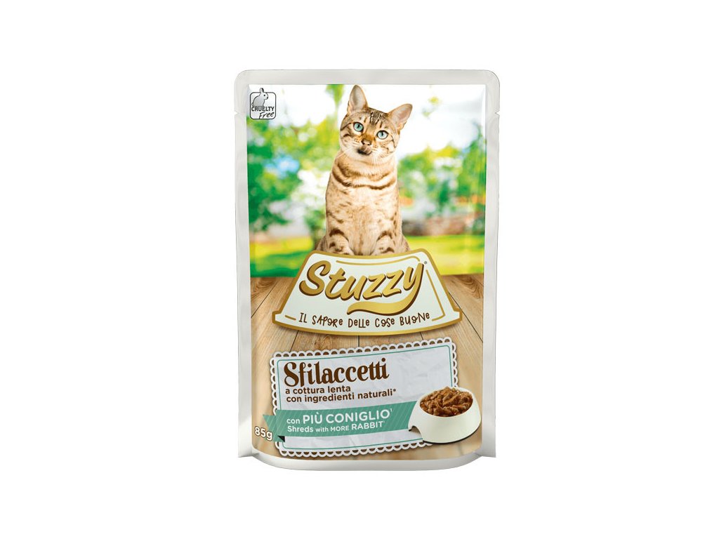 Stuzzy Cat Shreds - Trhané králičí maso je pomalu vařené maso do jemného rozpadnutí pro posílení jeho chuti. Každé sousto Vaší kočky tak proměníte na delikátní zážitek. Vaření v páře zachovává neporušenou chuť a výživné látky a receptura se připravuje bez přidání barviv nebo konzervačních látek.