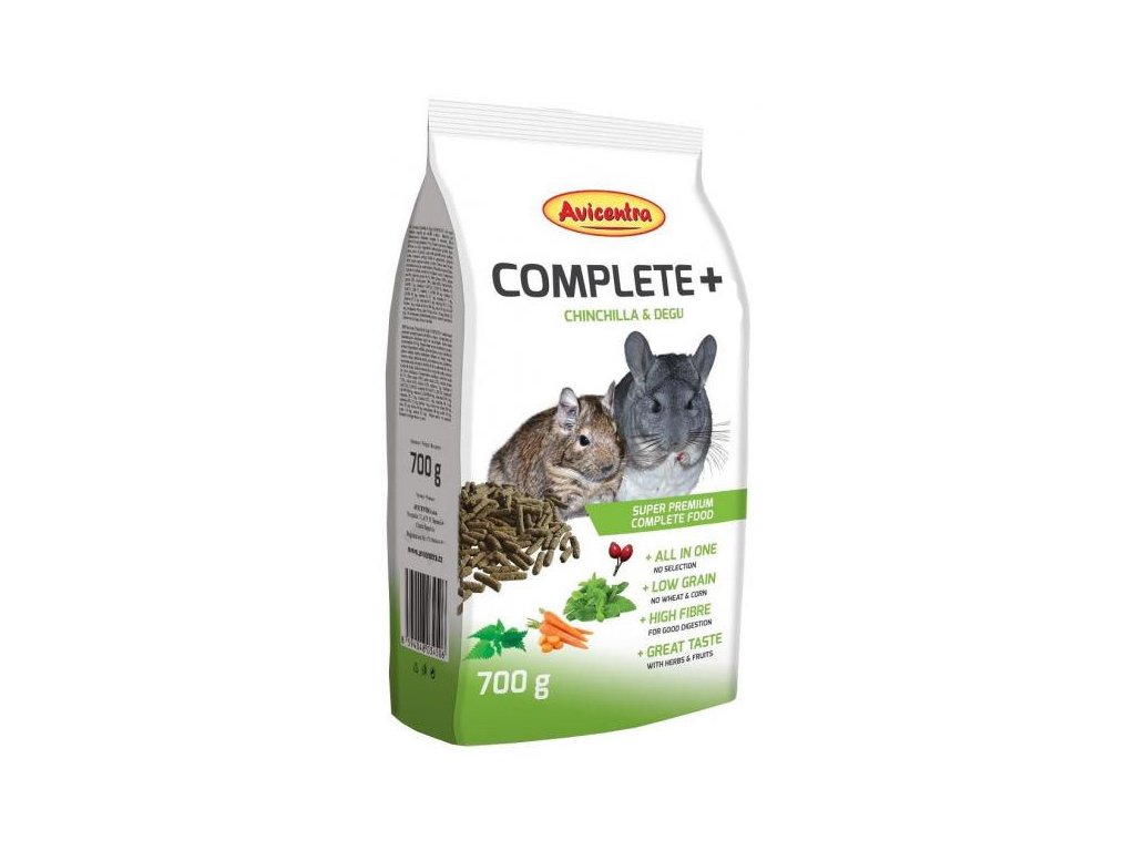 Avicentra Complete+ Činčila a osmák jsou křupavé extrudované pelety s bylinkami a vitamínem C pro činčily a osmáky. Speciálně tvarované pelety obsahují všechny živiny, které vaše činčila či osmák potřebují pro dlouhý, zdravý a šťastný život. Mají vysoký obsah vlákniny a udržují zuby ve skvělé kondici. Florastimul dělá totéž pro trávení a extrakt juky redukuje nepříjemné pachy v kleci.