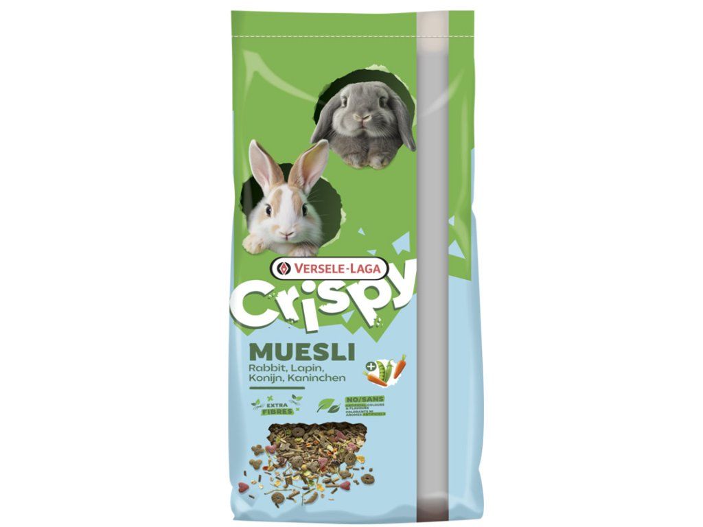 Versele Laga Crispy Muesli Rabbits je kompletní chutné krmivo vysoce kvalitní směsi s vysokým obsahem vlákniny pro (trpasličí) králíky. Směs s vysokým obsahem vlákniny pro dobré trávení a zdravé zuby. Extra fibres – přidaná vláknina pro lepší trávení a dentální péči. Obohaceno peletami "Happy & Healthy" pro optimální kondici. Jednoduché podávání díky praktickému uzavíratelnému obalu.