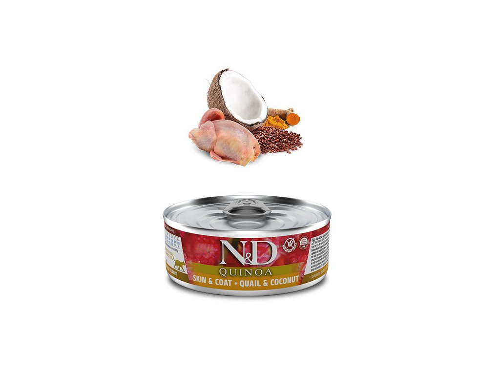 N&D Quinoa Skin &Coat je kompletní dietní krmivo pro kočky, doporučené ke snížení nesnášenlivosti vůči složkám a živinám krmiva.