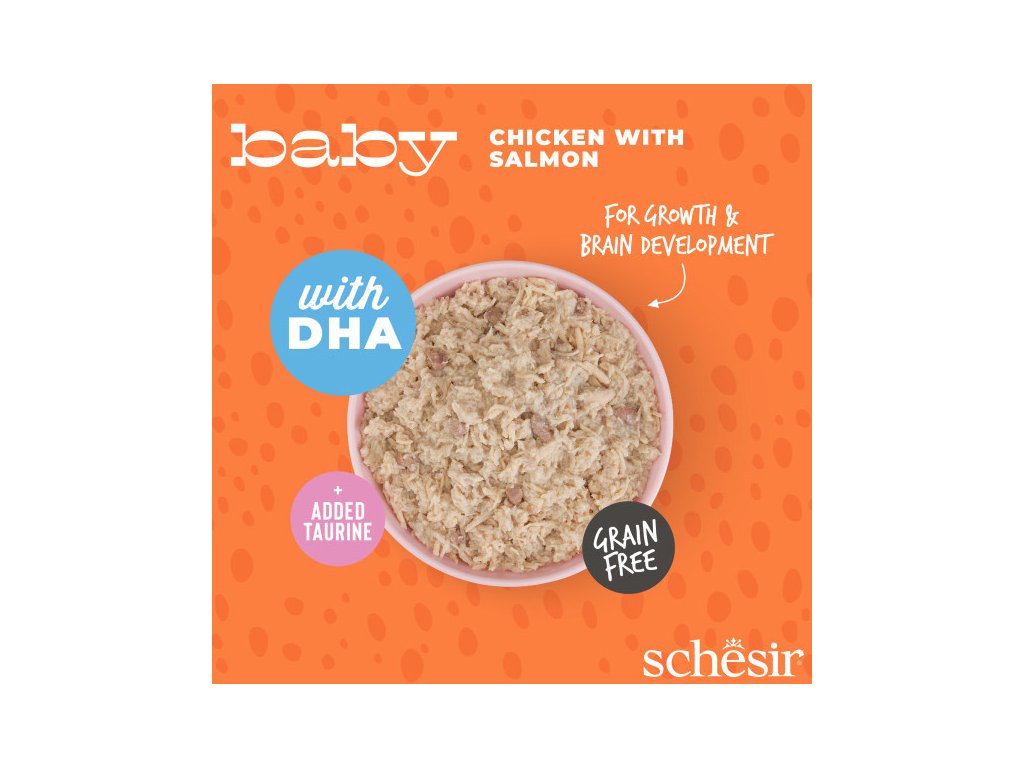 Koťata potřebují speciální péči při přechodu z mateřského mléka. Proto Schesir Baby&Kotě vyvinul kompletní a vyváženou recepturu s jemnou texturou masa pro uspokojení nutričních potřeb kotěte. Obsahuje taurín k podpoře růstu a DHA pro zdravý vývoj mozkových funkcí.