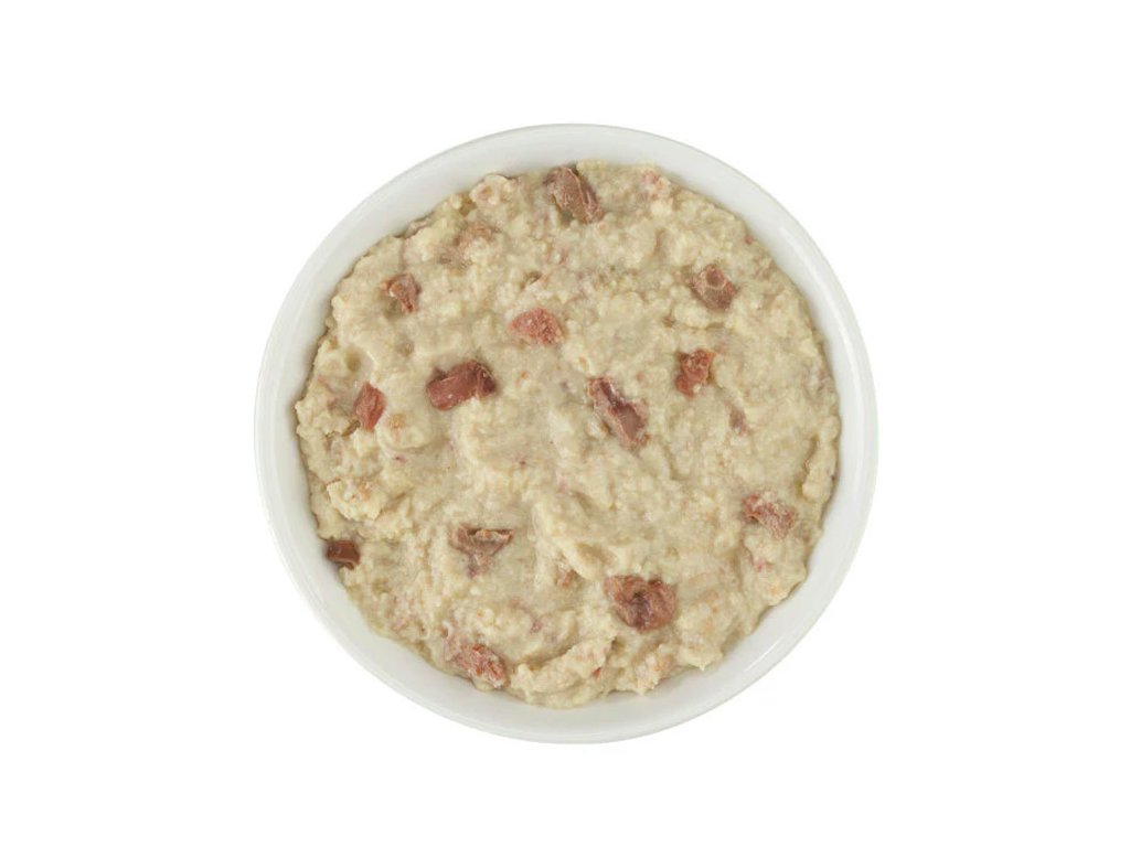 Složení: kuře 60% (žaludky 5%, játra 5%, srdce 5%), kuřecí vývar 33%, slunečnicový olej, tapioka, sušená vejce, minerální látky.