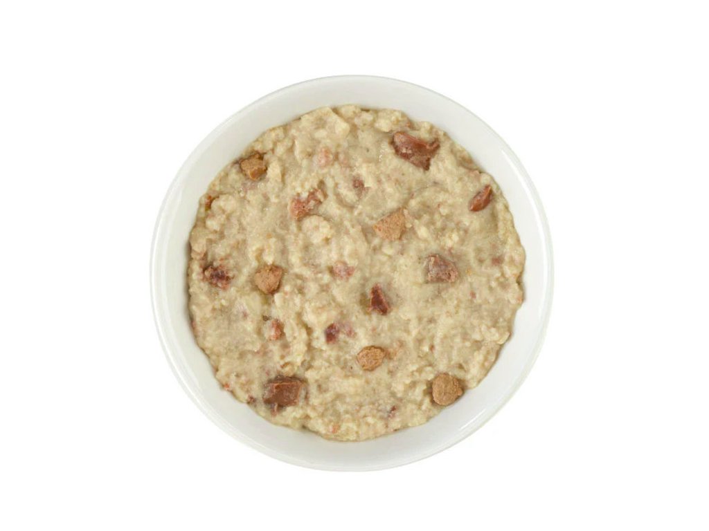 Složení: kuře 55% (žaludky 5%, játra 5%, srdce 5%), kuřecí vývar 33%, hovězí 6%, slunečnicový olej, tapioka, sušená vejce, minerální látky.
