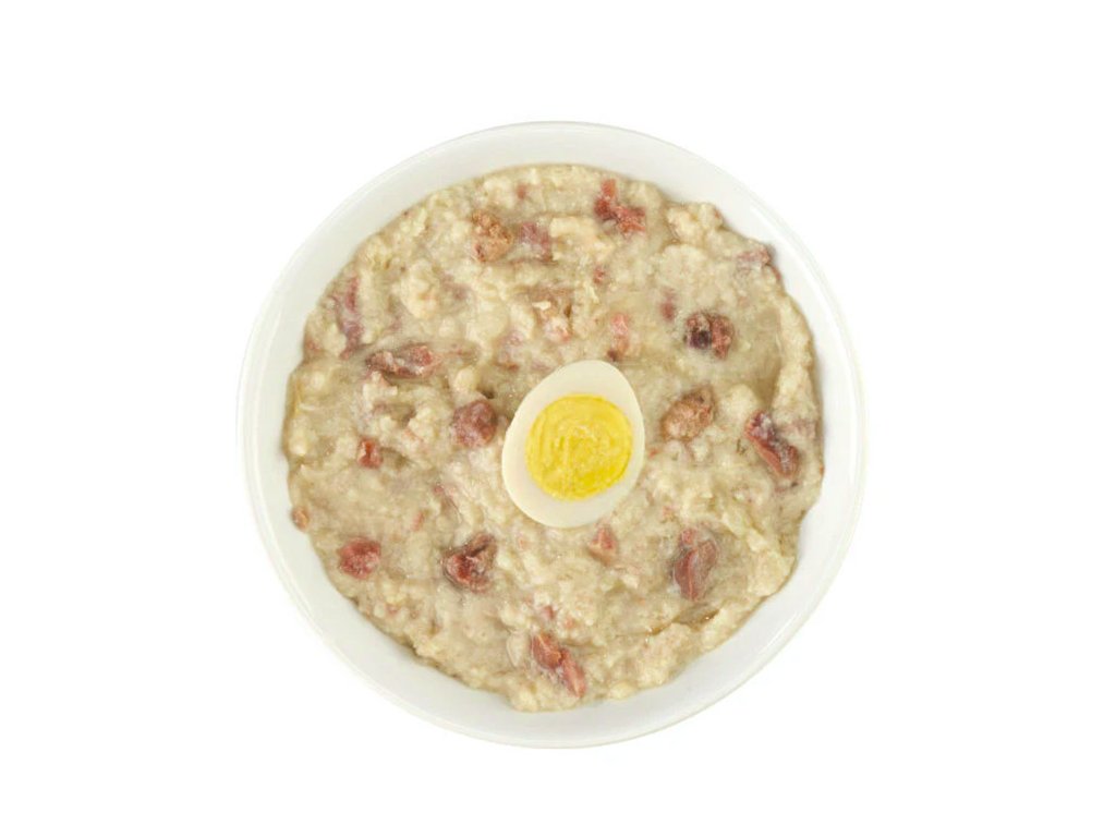 Složení: kuře 52% (žaludky 5%, játra 5%, srdce 5%), kuřecí vývar 35%, křepelčí vejce 6%, slunečnicový olej, tapioka, sušená vejce, minerální látky.