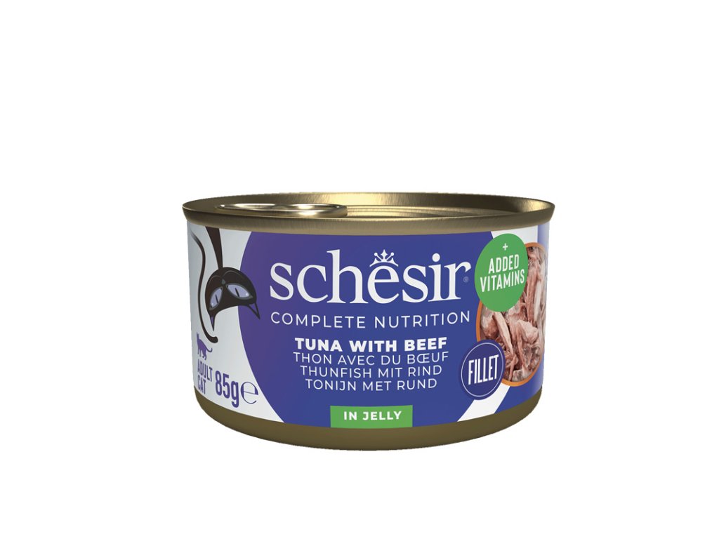 Schesir Cat Complete & Balanced Wet Adult - Tuňák a hovězí v želé je kompletní a vyvážené krmivo ve formě filetů z tuňáka a hovězího masa určené pro dospělé kočky. Díky obsahu vitamínů a minerálních látek jde o plnohodnotné krmivo vhodné ke každodennímu krmení.