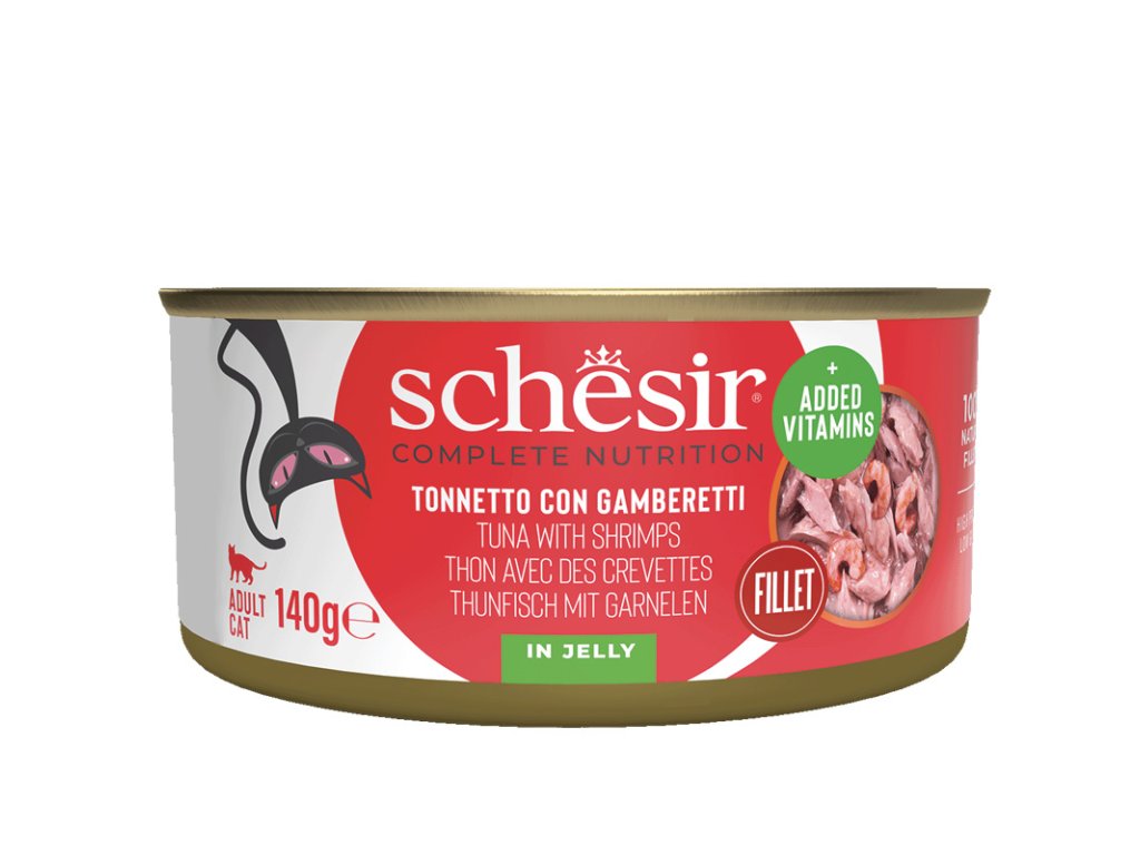 Schesir Cat Complete & Balanced Wet Adult - Tuňák a krevety v želé je kompletní a vyvážené krmivo ve formě filet z tuňáka s kousky vařených krevet určené pro dospělé kočky. Doplněné o vitamíny a minerální látky z něj dělají plnohodnotné krmivo vhodné pro každý den.