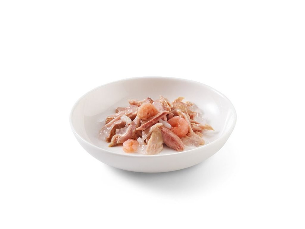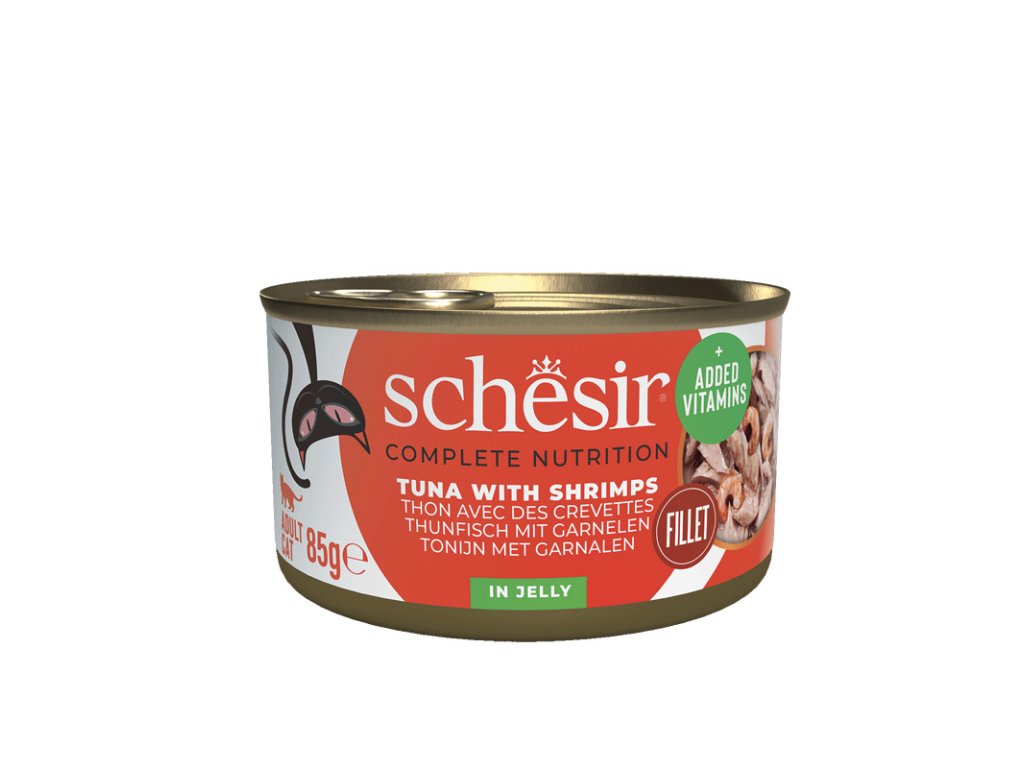 Schesir Cat Complete & Balanced Wet Adult - Tuňák a krevety v želé je kompletní a vyvážené krmivo ve formě filetů z tuňáka s kousky vařených krevet určené pro dospělé kočky. Doplnené o vitamíny a minerální látky z něj dělají plnohodnotné krmivo vhodné pro každý den.