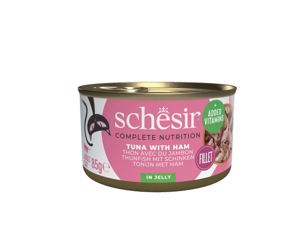 Schesir Cat Complete & Balanced Wet Adult - Tuňák se šunkou v želé je kompletní a vyvážené krmivo ve formě filetů z tuňáka doplněné kousky dušené vepřové šunky určené pro dospělé kočky. Doplněné o vitaminy a minerální látky z něj dělají plnohodnotné krmivo vhodné pro každý den.