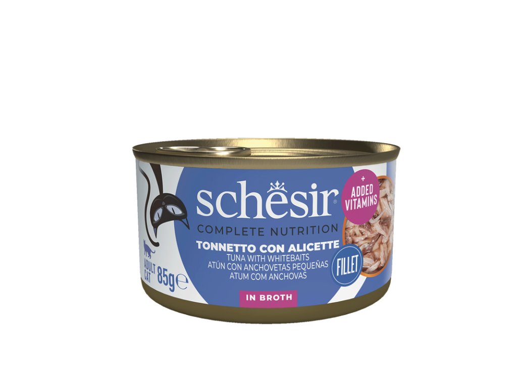Schesir Cat Complete & Balanced Wet Adult - Tuňák s ančovičkami ve vývaru je kompletní a vyvážené krmivo ve formě filetů z tuňáka a celých kousků ančoviček určené pro dospělé kočky. Doplnené o vitaminy a minerální látky z něj dělají plnohodnotné krmivo vhodné na každý den.