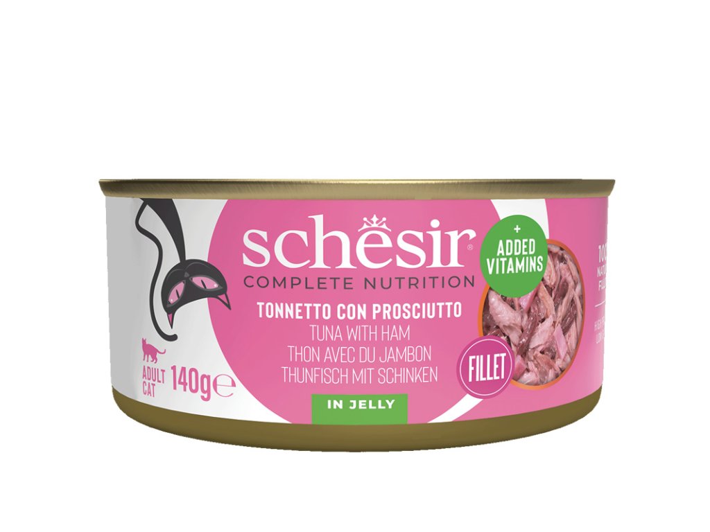 Schesir Cat Complete & Balanced Wet Adult - Tuniak so šunkou v želé je kompletné a vývážené krmivo vo forme filiet z tuniaka doplnené o kúsky dusenej bravčovej šunky určené pre dospelé mačky. Doplnené o vitamíny a minerálne látky z neho robia plnohodnotné krmivo vhodné na každý deň.