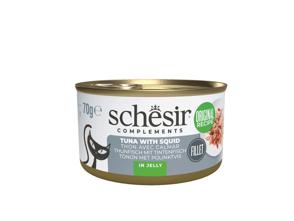 Schesir Complements Cat - Tuňák s kalmary je doplňkové krmivo pro dospělé kočky všech plemen. Původní originální receptura Schesir v novém 70g balení.